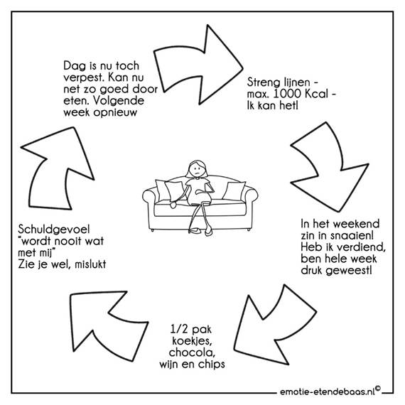 Maar veel mensen nemen deze gedachten wél voor waar aan. Er ontstaat een vicieuze cirkel van negatieve gedachten over jezelf, balen, eten om je even beter te voelen, nog meer balen van het feit dat je bent gaan eten en de neiging om vervolgens de handdoek in de ring te gooien en morgen weer opnieuw te beginnen. Met op lange termijn jojo-effect als gevolg.